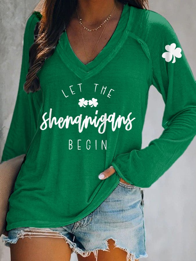 Women's Funny St. Patrick's Day Let The Shenanigans Begin Shamrock Print Casual Long-Sleeve Top