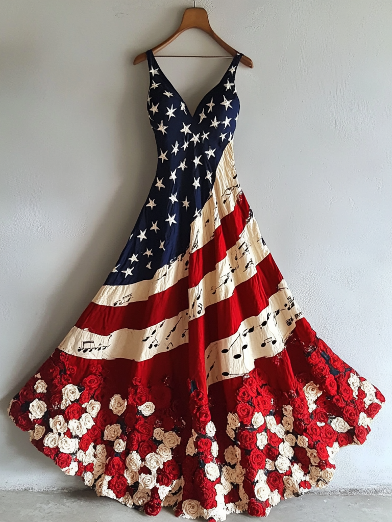 Women's Independence Day Flag And Floral Musical Notes Pattern Sleeveless Dress
