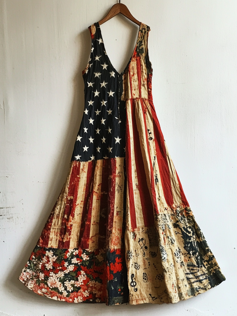 Women's Independence Day Flag And Floral Musical Notes Pattern Sleeveless Dress