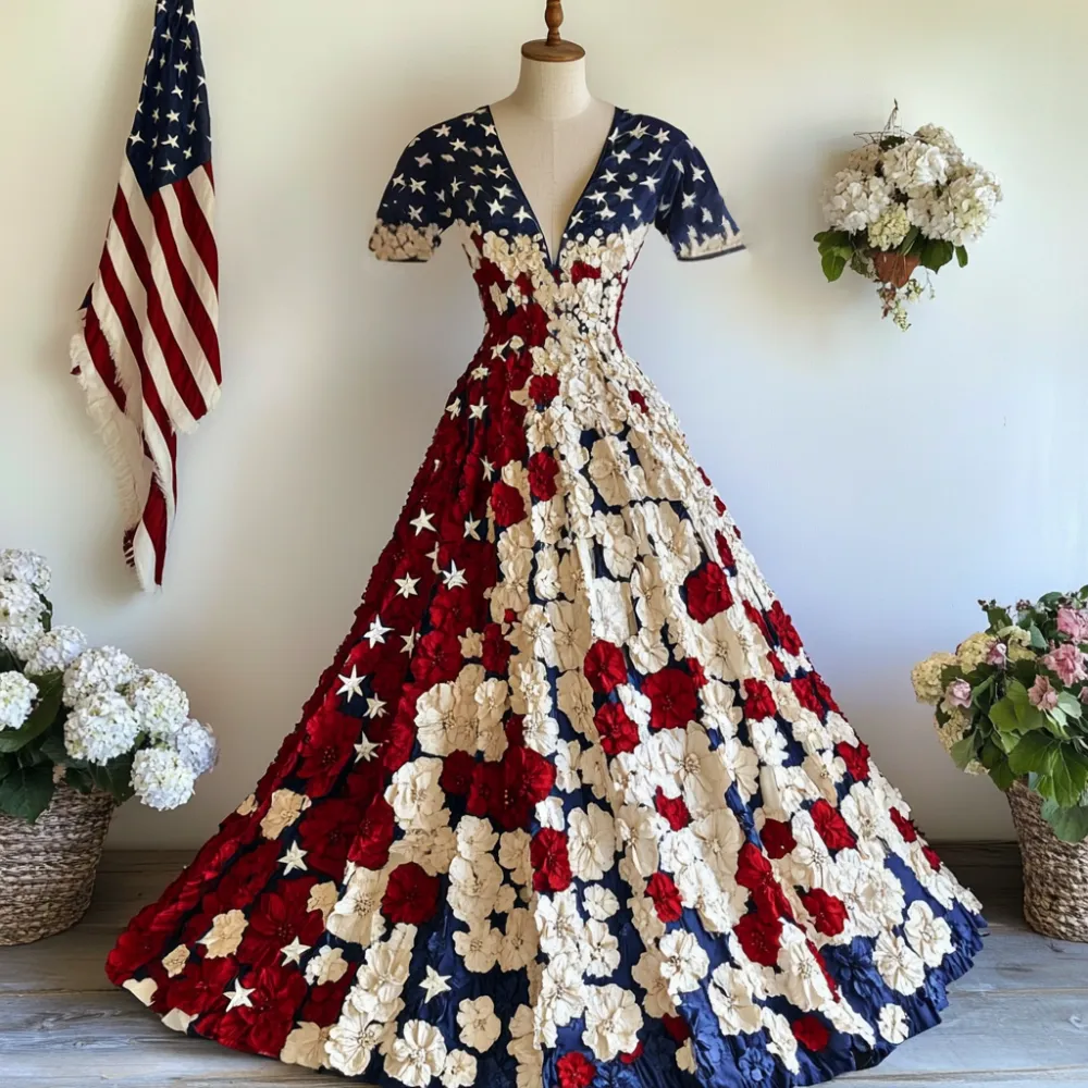• Women's Independence Day Flag And Floral Print Short Sleeve Dress