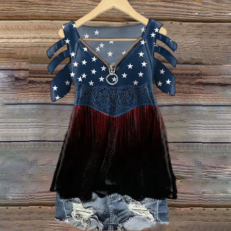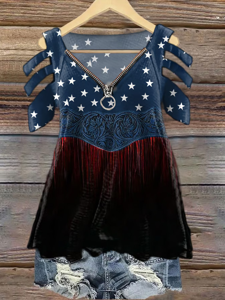 Women's Independence Day Flag Denim Blue Print V-neck T-shirt