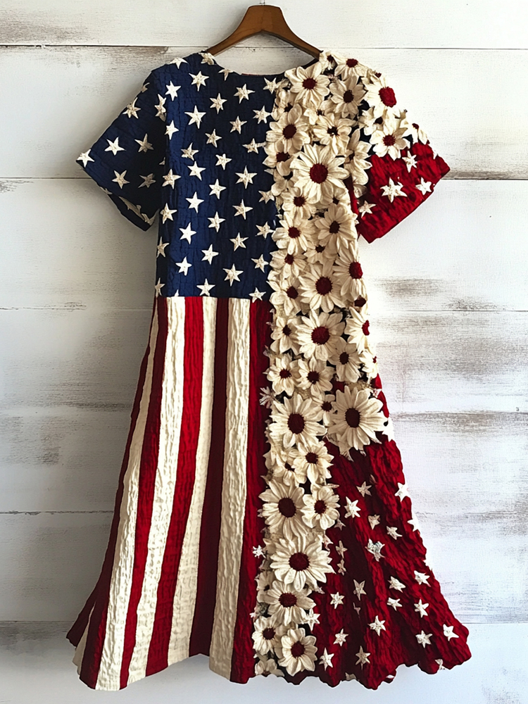 Women's Independence Day Flag Floral Art Short Sleeve Dress