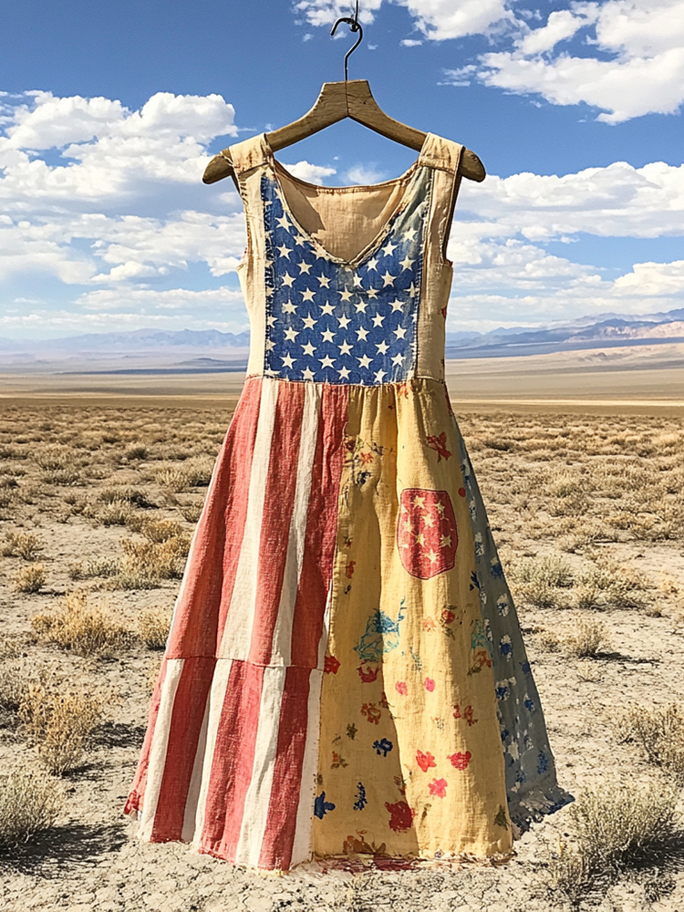 Women's Independence Day Flag Floral Cotton And Linen Dress