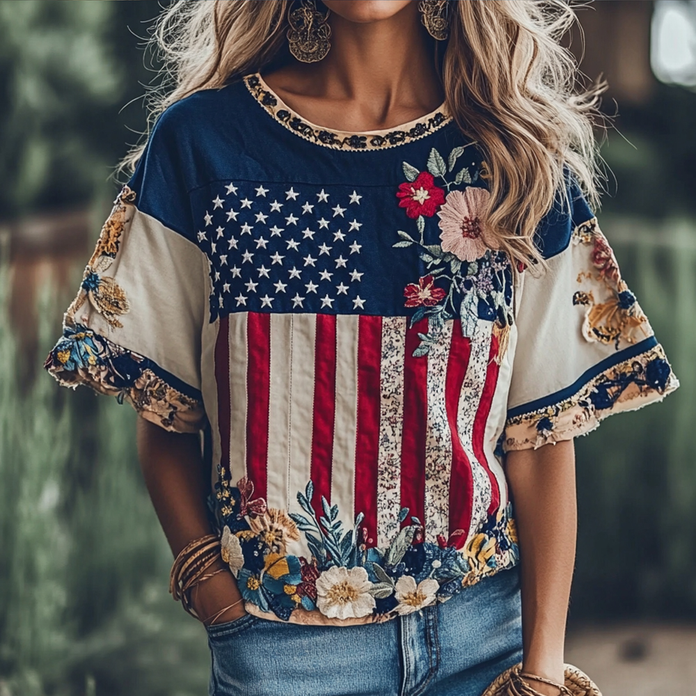 Women's Independence Day Flag Floral Embroidery Print Round Neck T-shirt