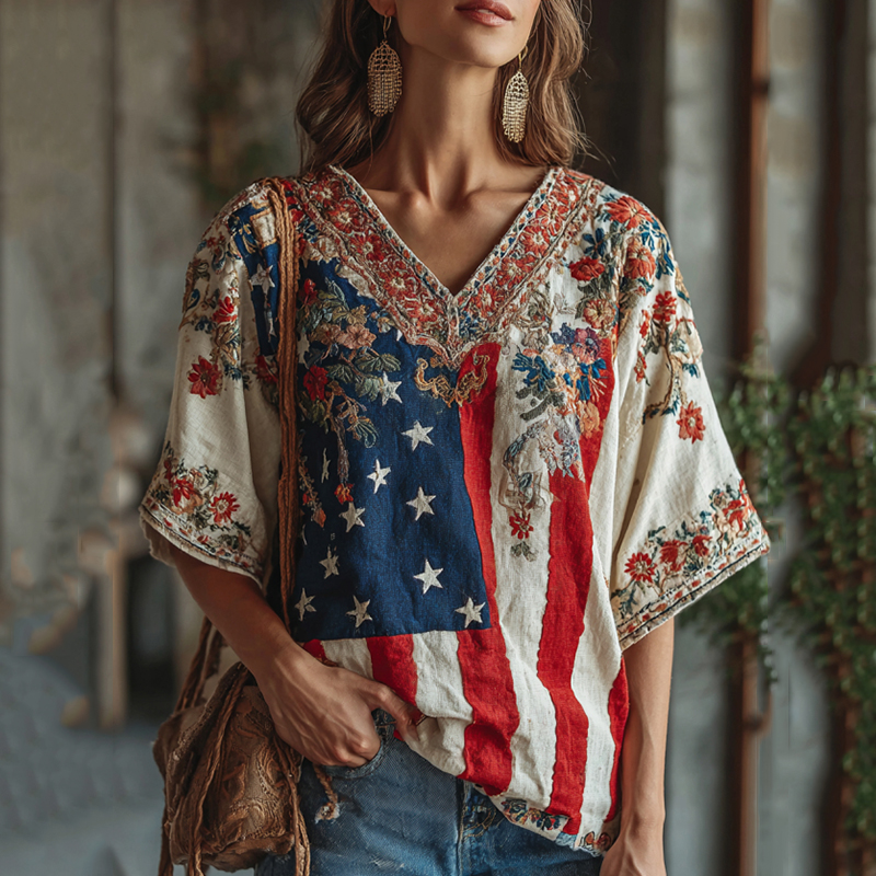 Women's Independence Day Flag Flower Embroidered Linen Blend T-shirt