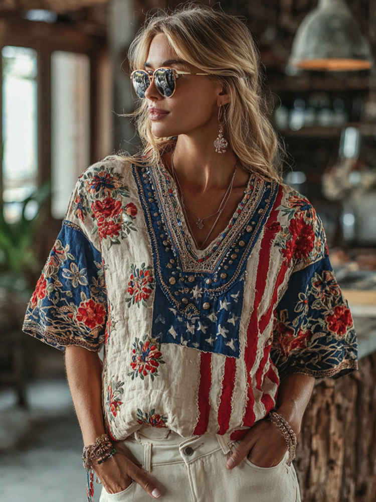 Women's Independence Day Flag Flower Embroidered Short Sleeve Linen Blend T-shirt