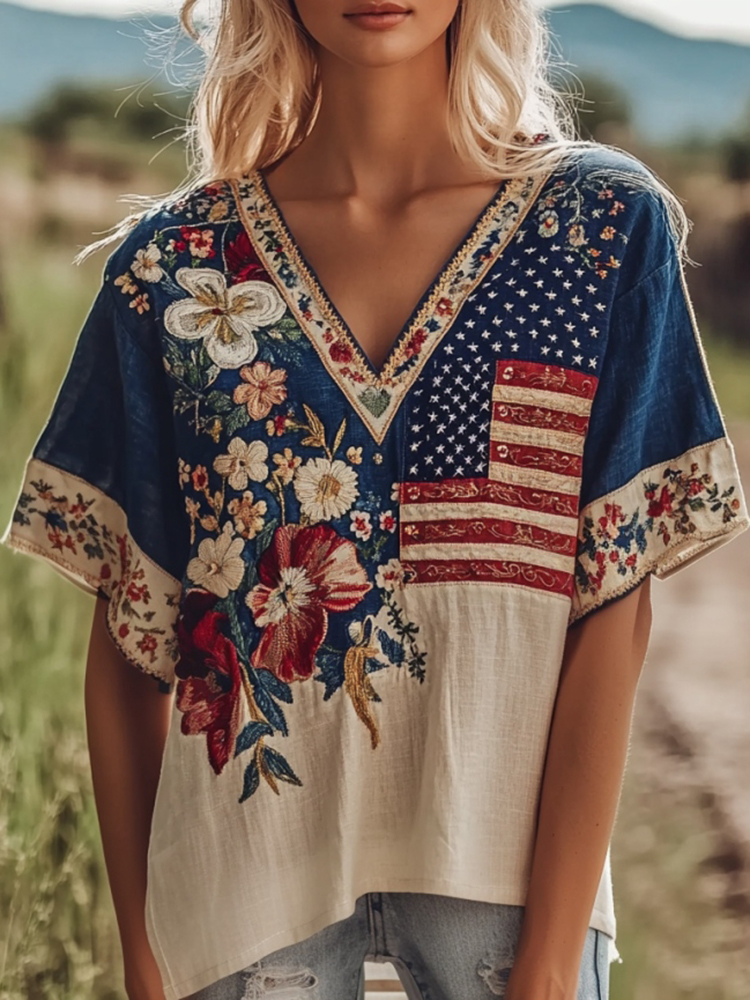 • Women's Independence Day Flag Flower Embroidered V-neck Linen Blend T-shirt
