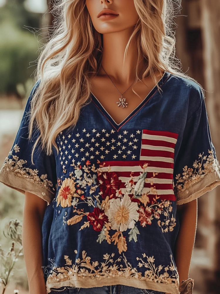 Women's Independence Day Flag Flower Embroidered V-neck Linen Blend T-shirt