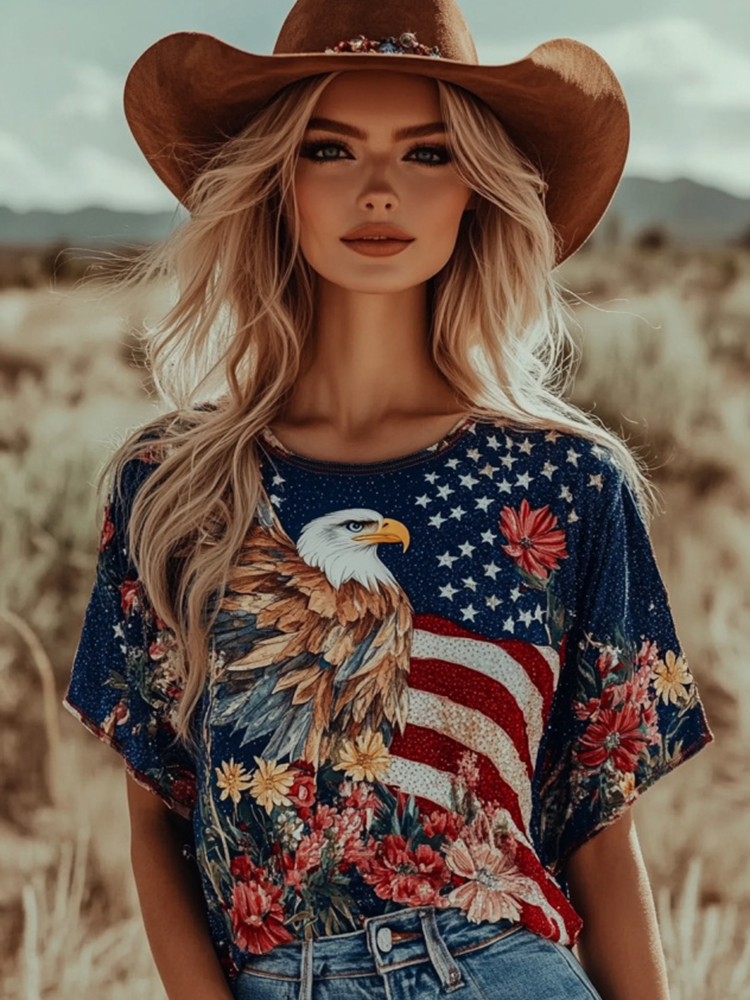 Women's Independence Day Floral And Eagle Art Crew Neck T-shirt