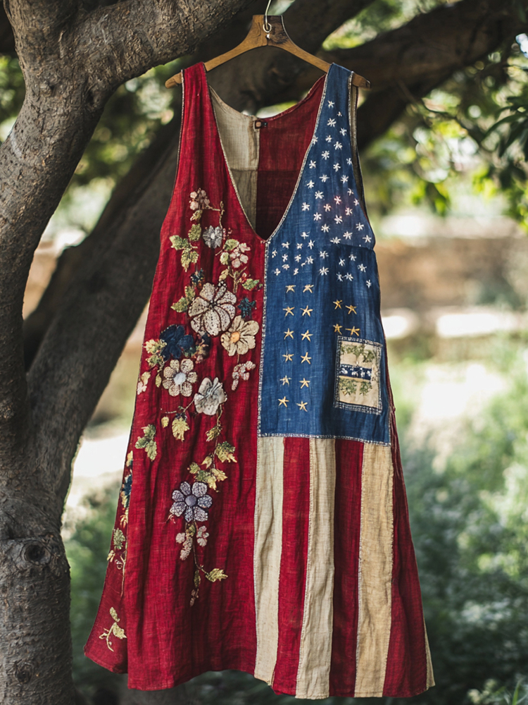 Women's Independence Day Floral Embroidered Patchwork Art V-neck Tank Midi Dress