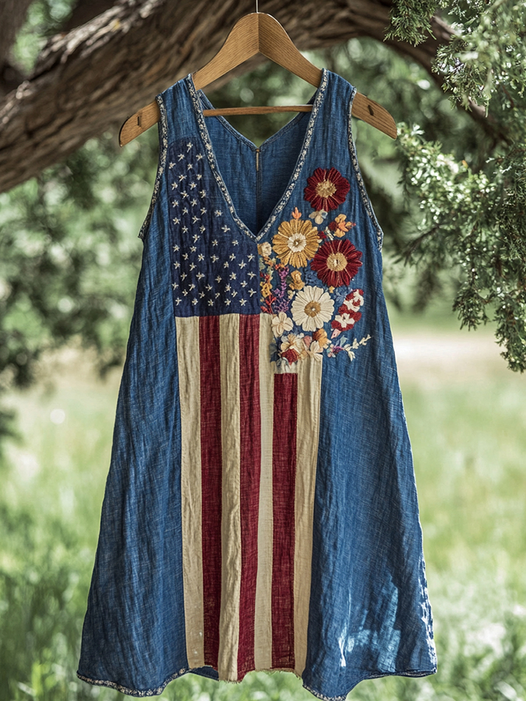 Women's Independence Day Floral Embroidered V-neck Tank Midi Dress