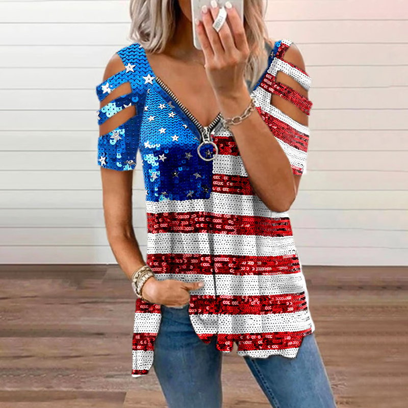 Women's Independence Day Printed V-neck Zipper Casual T-shirt
