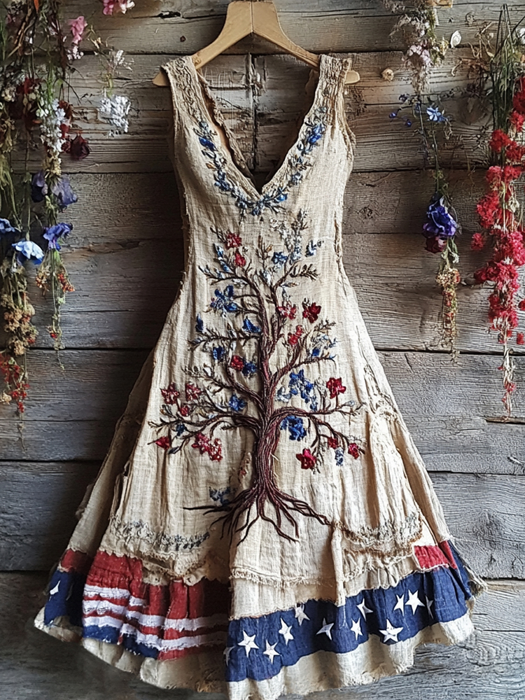 Women's Independence Day Tree Of Life Embroidered V-neck Tank Midi Dress