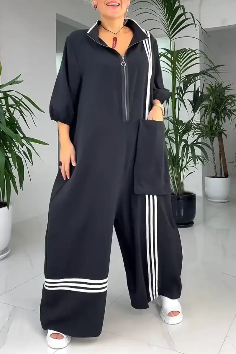 Women's Lapel Mid-Sleeve Striped Casual Jumpsuit