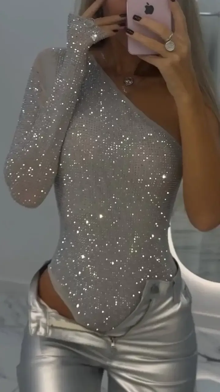 Women's One-shoulder Tight-fitting Rhinestone Top