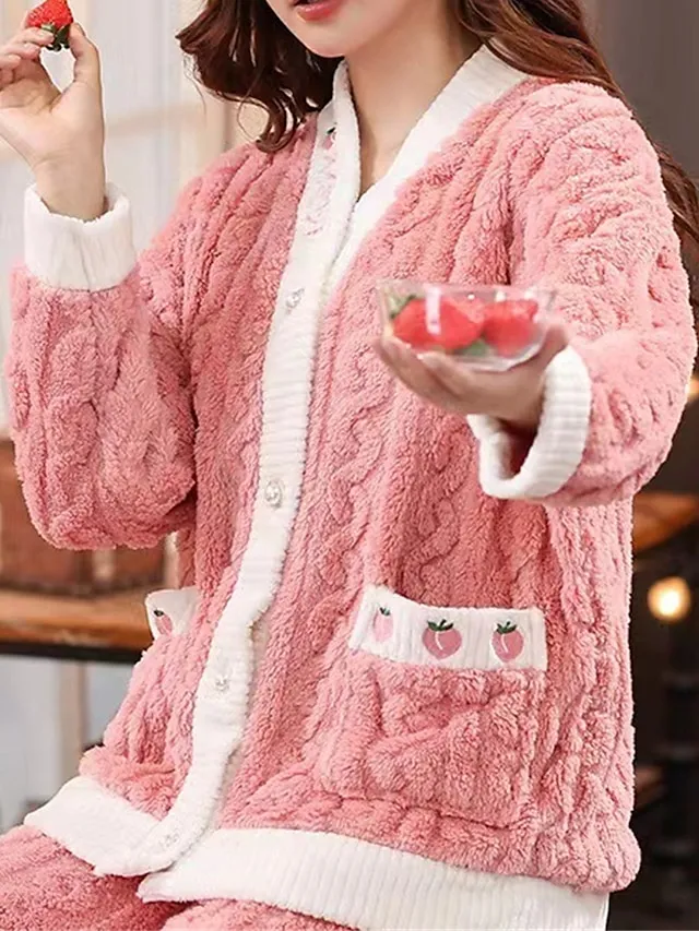 Women's Pajamas Sets Fruit Plush Casual Comfort Home Bed Flannel Warm Breathable V Wire Long Sleeve Shirt Pant Button Pocket Fall Winter Home Outfits