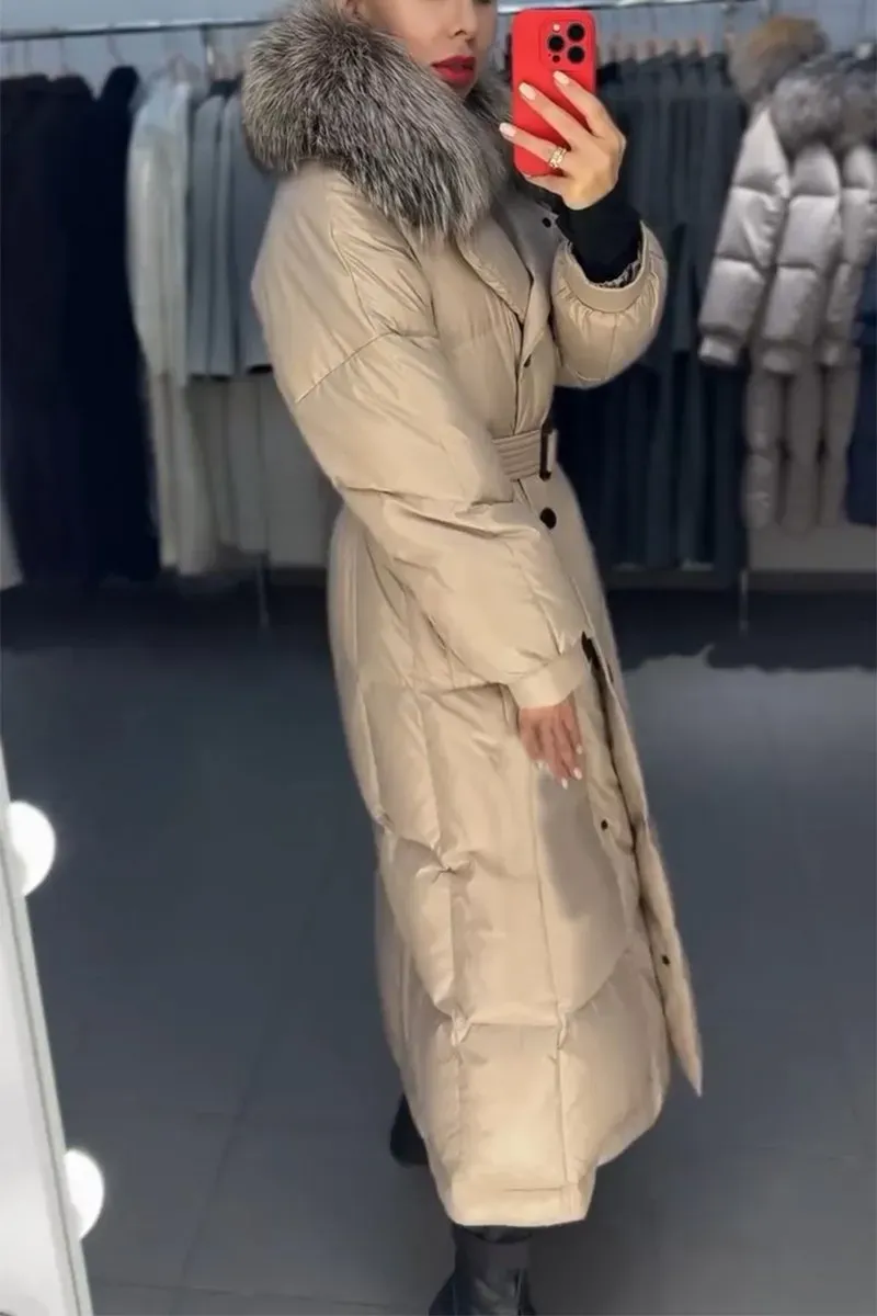 Women's Retro Elegant Hooded Fur Collar Belt Pocket Button Long Cotton Coat
