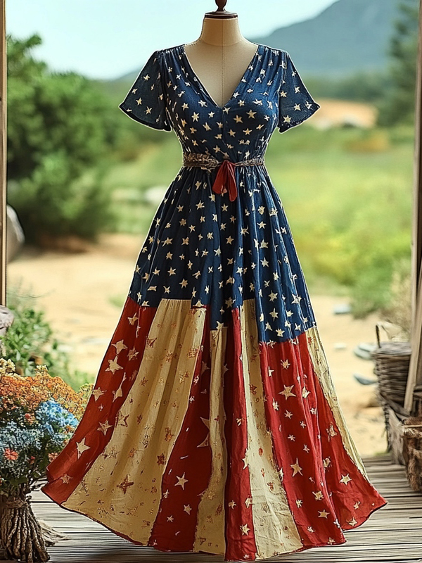 Women's Retro Independence Day Flag Color Print Short Sleeve Dress