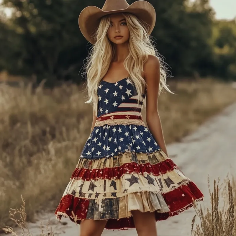 Women's Retro Independence Day Patchwork American Flag Art Casual Linen Midi Dress