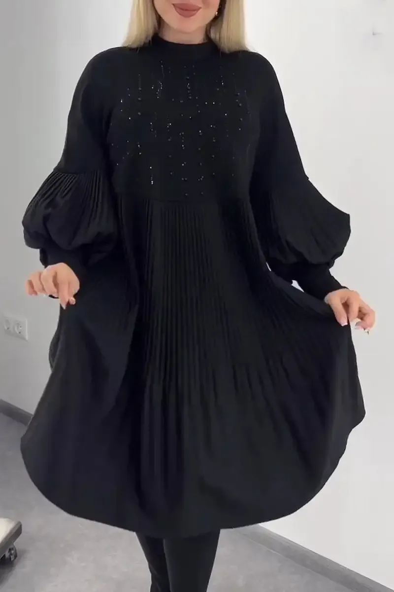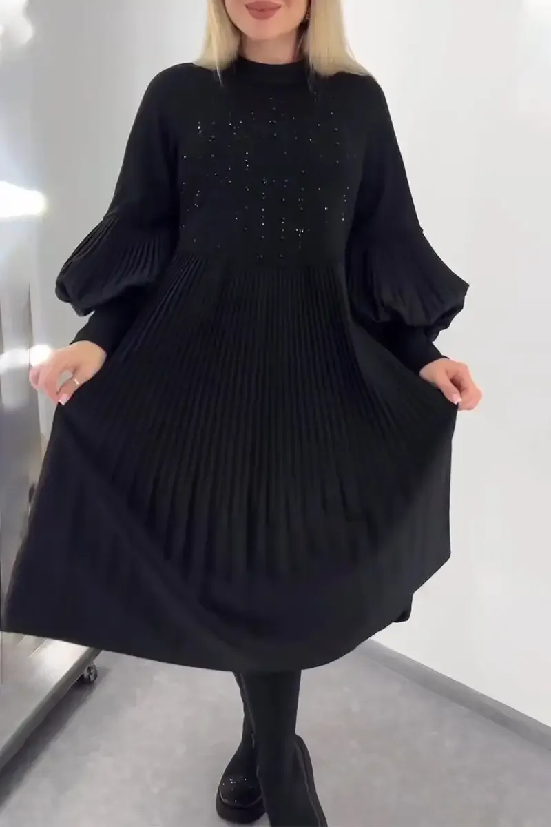 Women's Round Neck Lantern Sleeve Rhinestone Pleated Dress