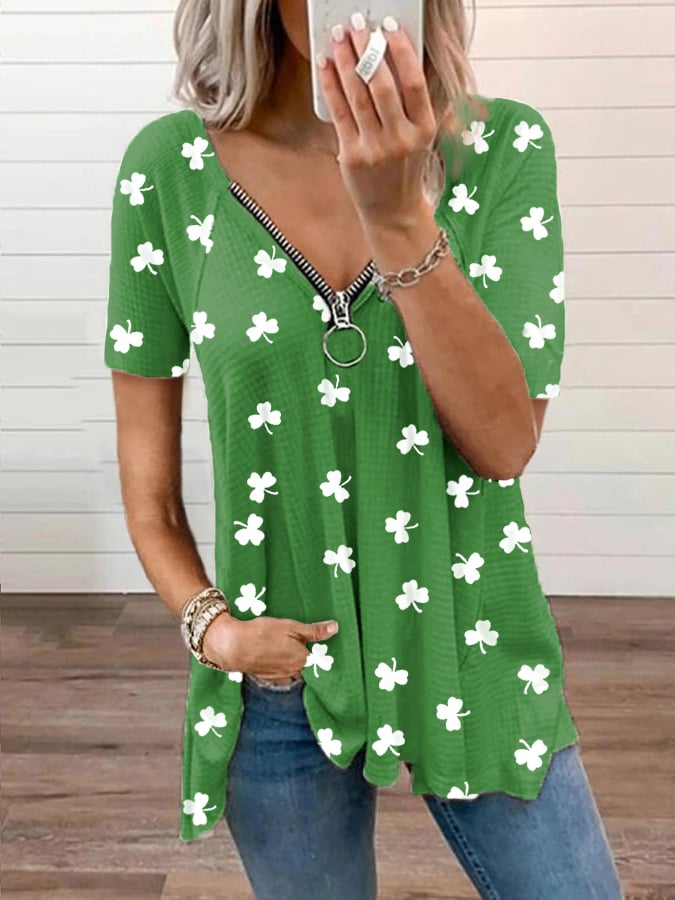 Women's St. Patrick's Day Lucky Shamrock Print Zipper V-Neck Top