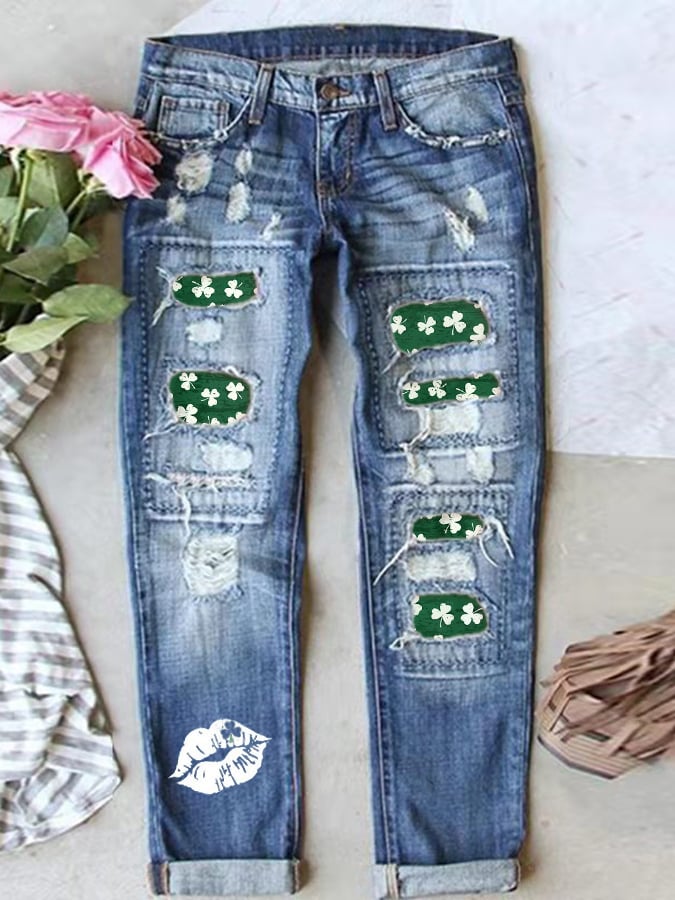 Women's St. Patrick's Day Lucky Shamrock Washed Straight Jeans
