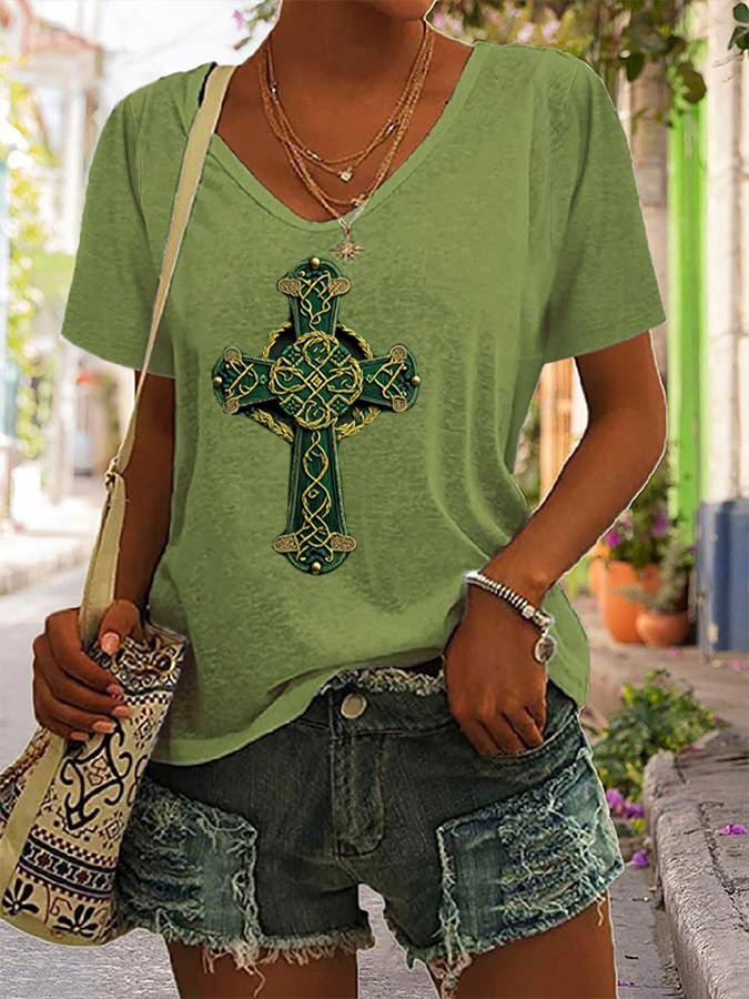 Women's St. Patrick's Day Shamrock Cross Art Print V-Neck T-Shirt