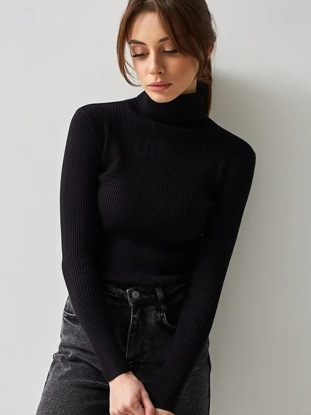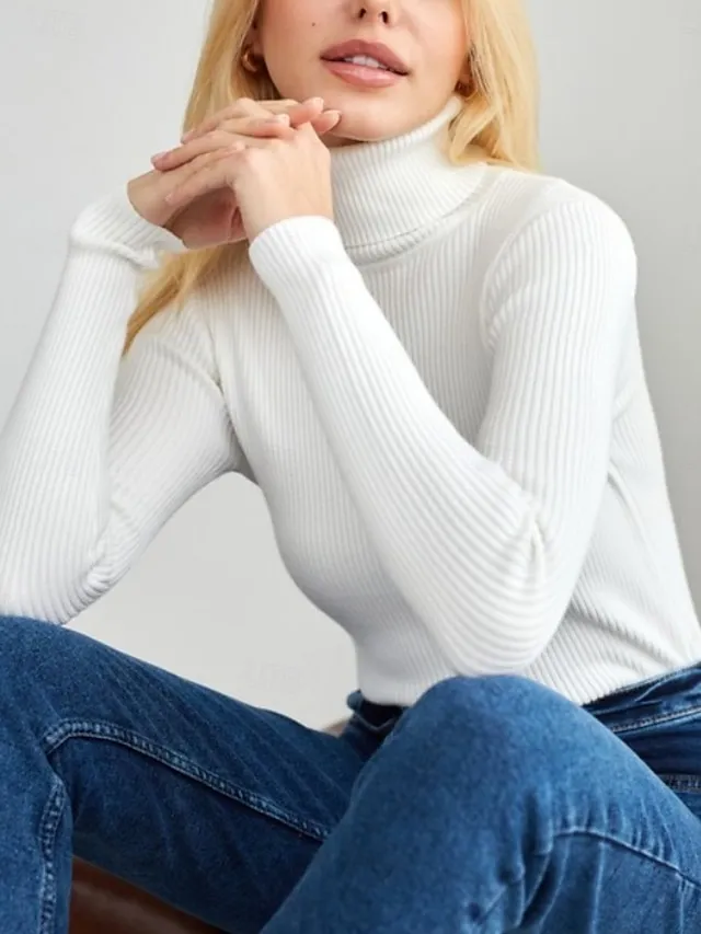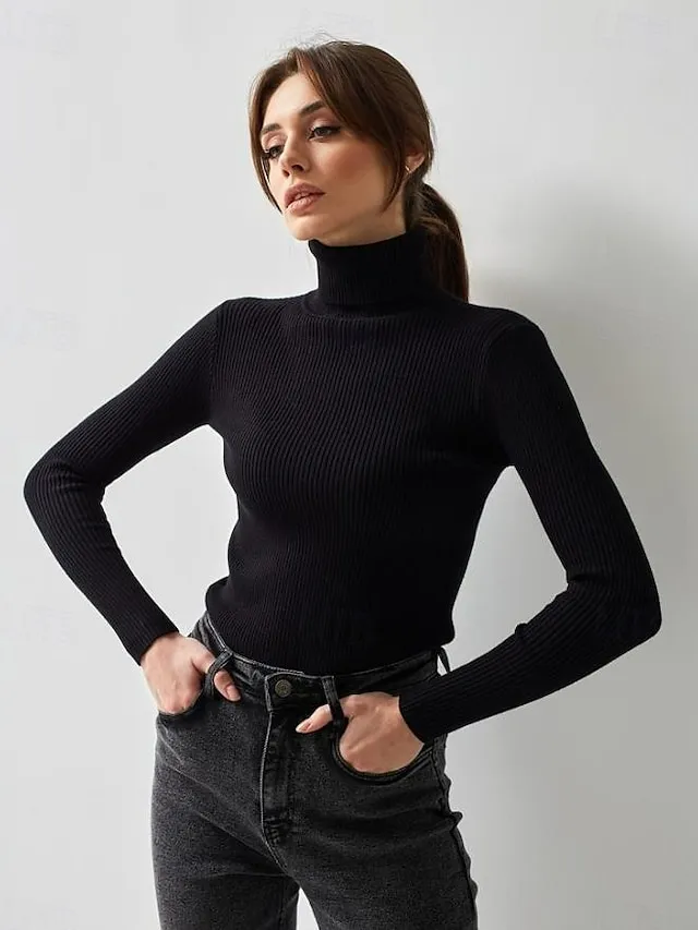 Women's Sweater Casual Soft Pure Color Ribbed Turtleneck Knitted Long Sleeve Regular Tops Knit Outdoor Daily Weekend Black White Fall Winter