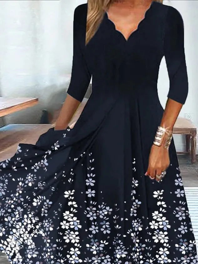 Women's Swing Dress Floral Dress Midi Dress 3/4 Length Sleeve Floral Print V Neck Dress