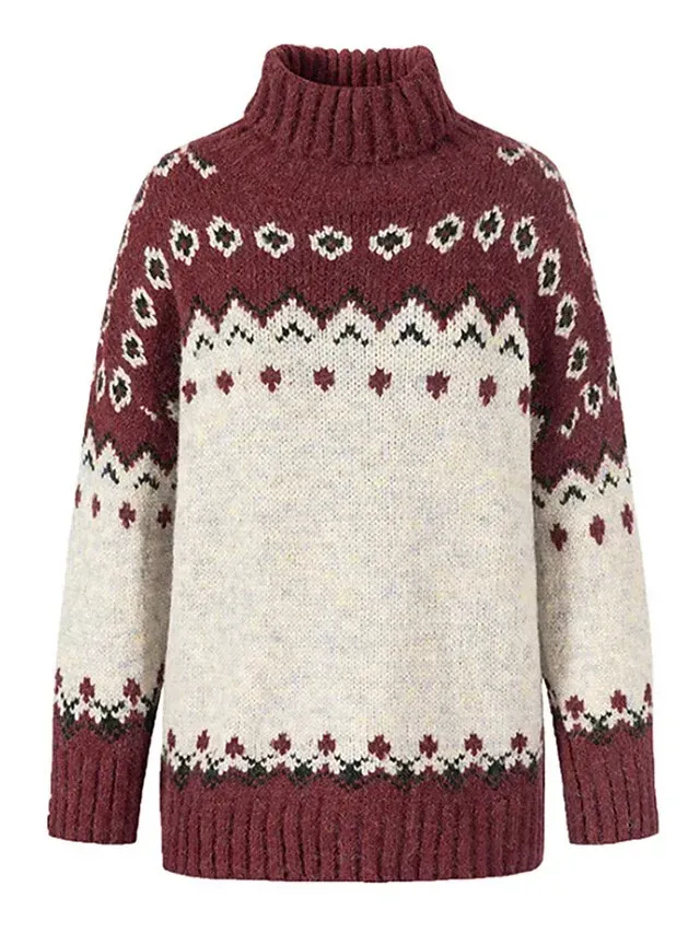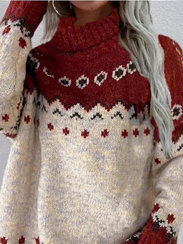 Women's Ugly Christmas Sweater Pullover Sweater Jumper Turtleneck Ribbed Knit Acrylic Patchwork Fall Winter Regular Xmas Daily Going out Stylish Casual Soft Long Sleeve Geometric Red S M L