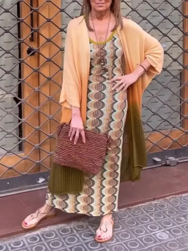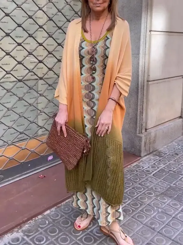 Women's V-neck Sleeveless Printed Dress with Gradient Cardigan Suit