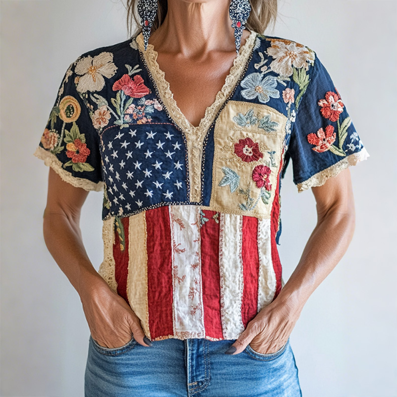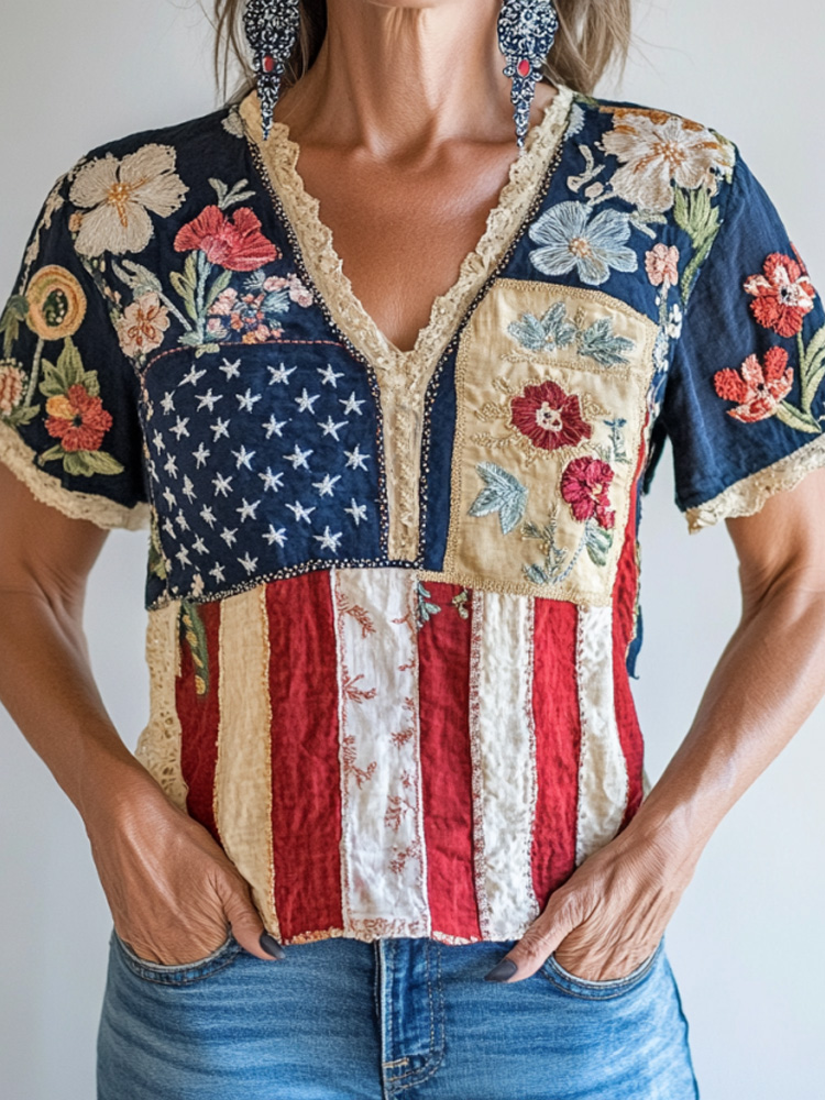 • Women's Vintage American Flag Sunflower Floral Embroidery Cotton And Linen V-neck T-shirt