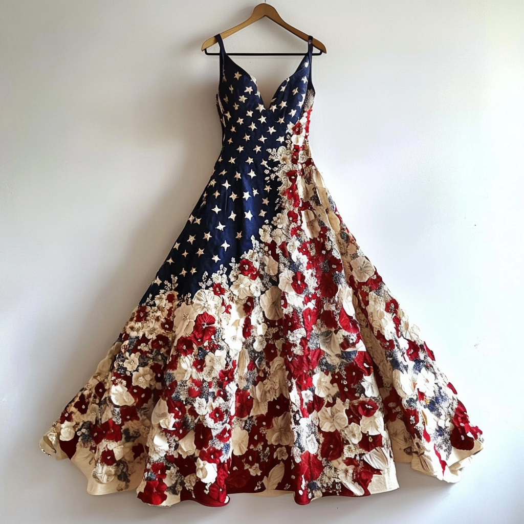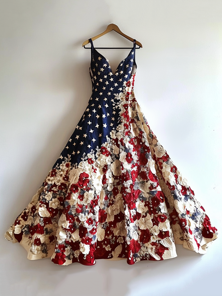 Women's Vintage Independence Day Flag And Floral Pattern Suspender Dress