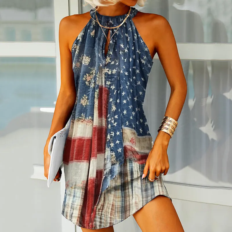 Women's Vintage Independence Day Flag Check Halter Dress