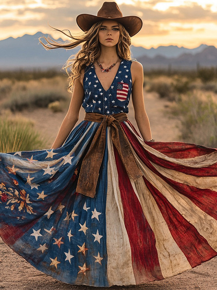 Women's Vintage Independence Day Flag Cowgirl Sleeveless Casual Maxi Dress