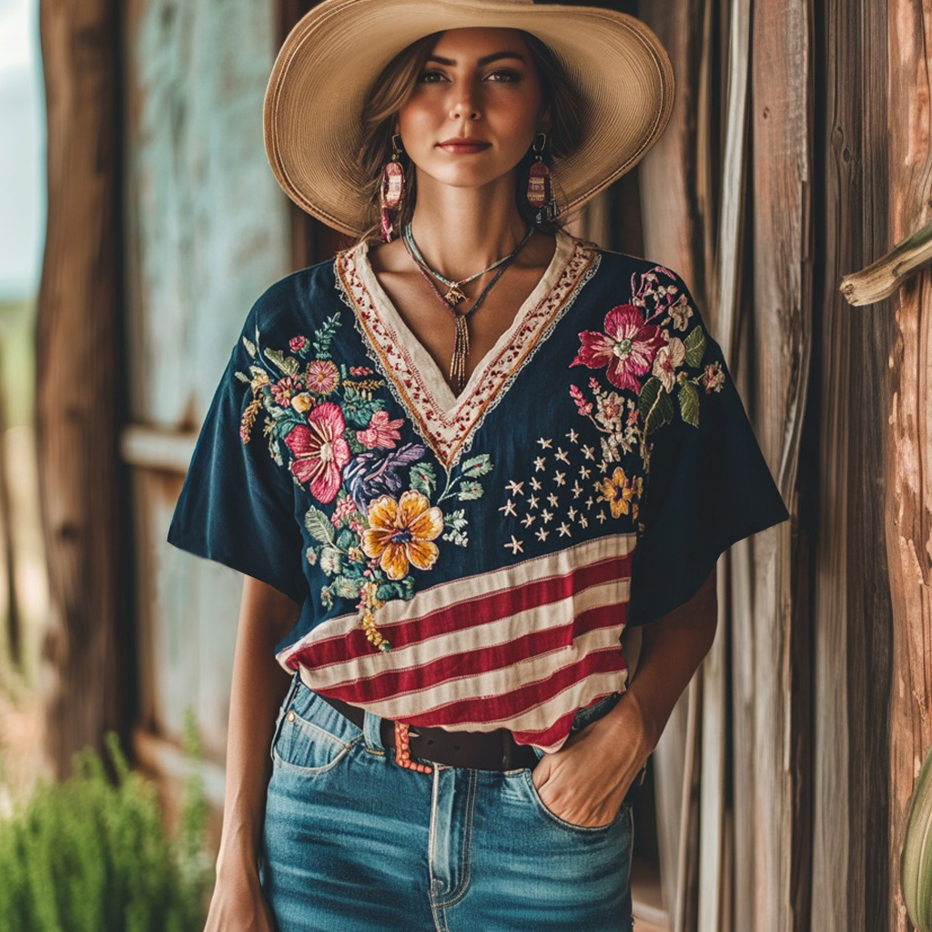 Women's Vintage Independence Day Flag Floral Embroidery V-neck T-shirt