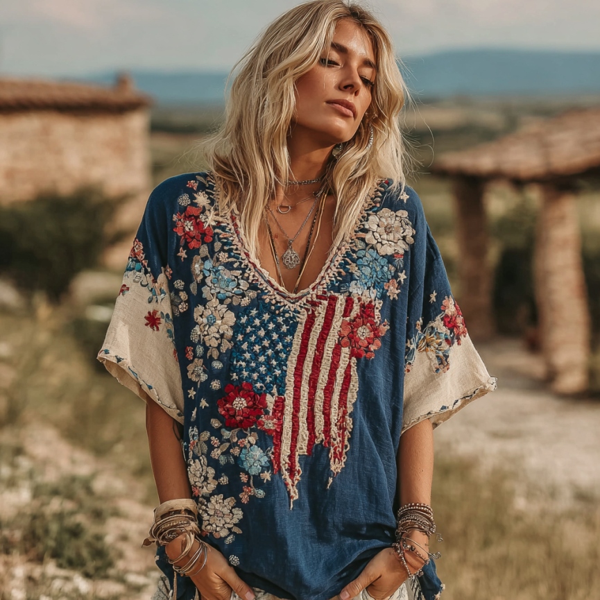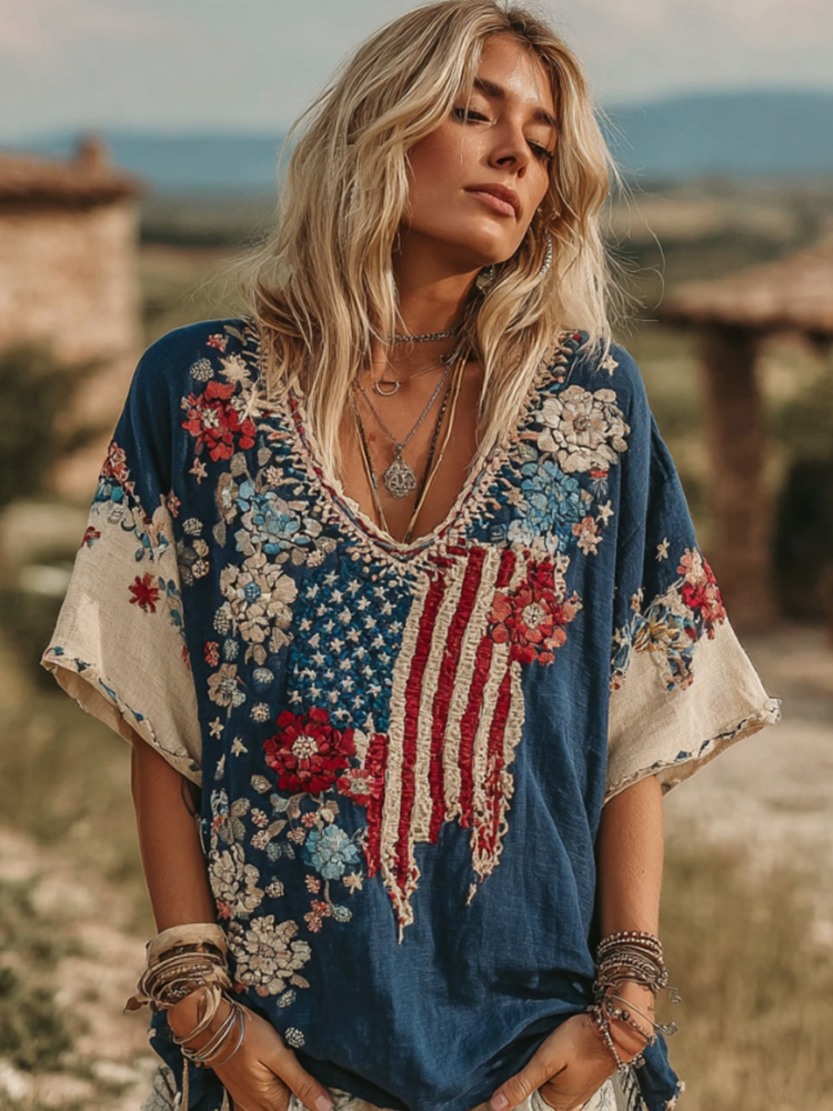 • Women's Vintage Independence Day Flag Floral Embroidery V-neck T-shirt