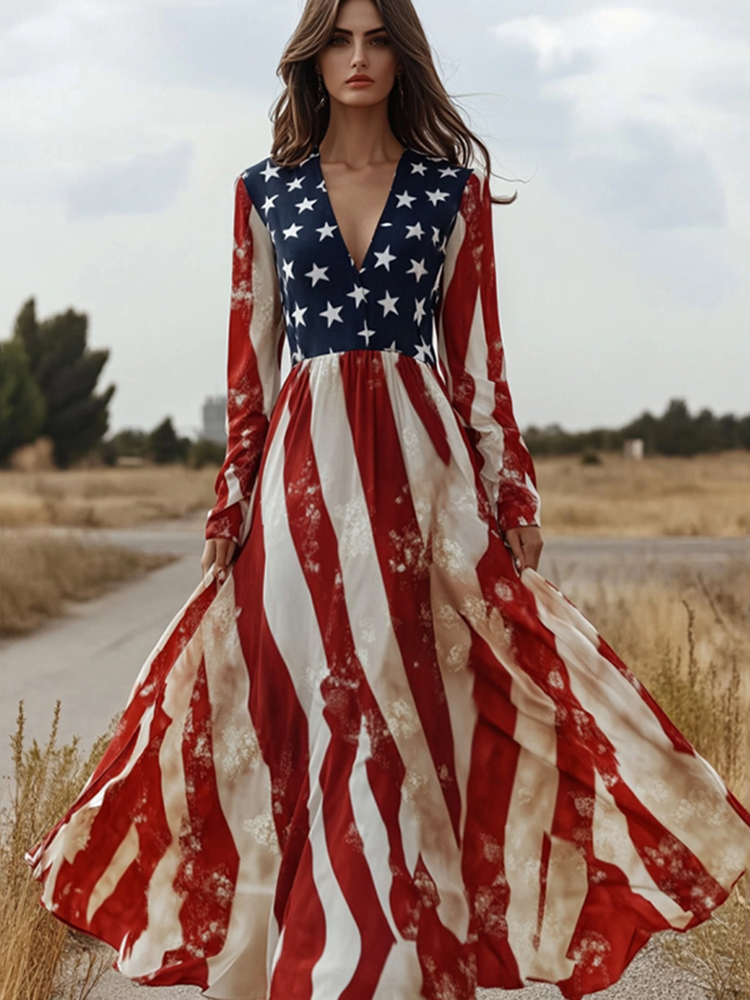 Women's Vintage Independence Day Flag Long Sleeve Maxi Dress