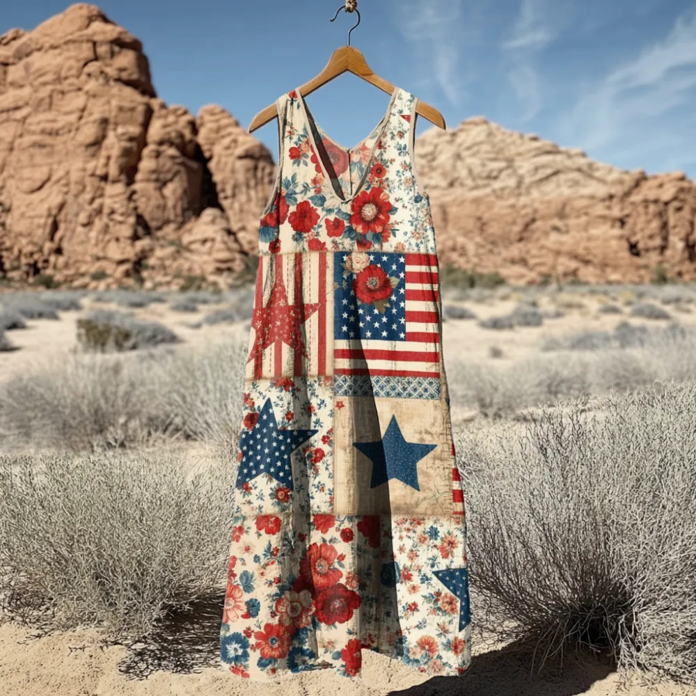 Women's Vintage Independence Day Flag Print V Neck Tank Midi Dress