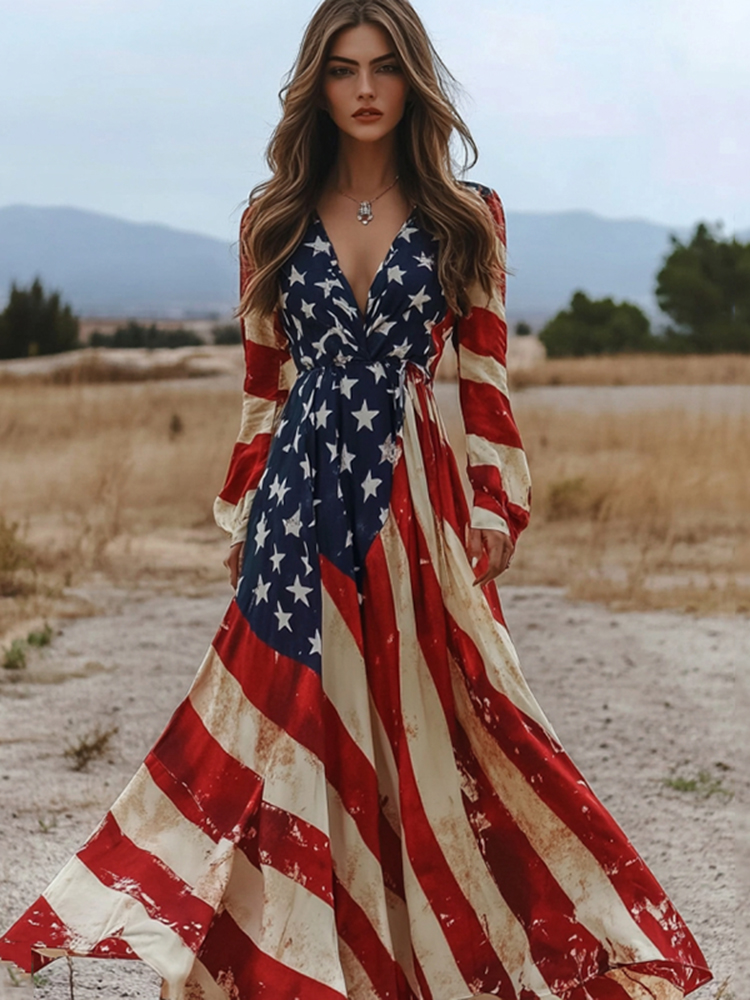 Women's Vintage Independence Day Flag Printed Casual Maxi Dress