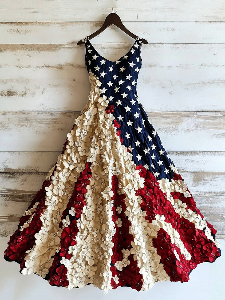Women's Vintage Independence Day Flowers Art Linen Midi Dress
