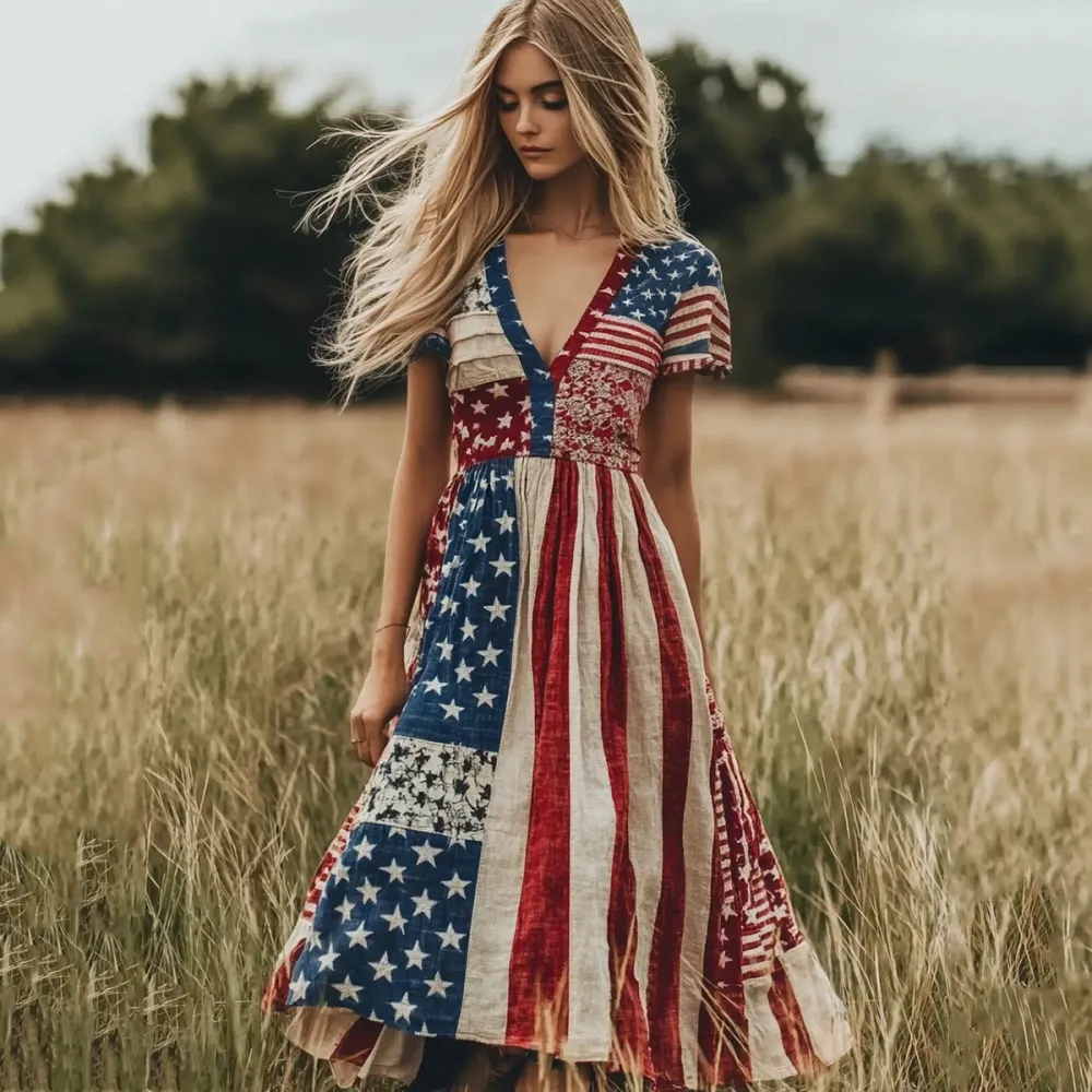 Women's Vintage Independence Day Print Linen Blend Midi Dress