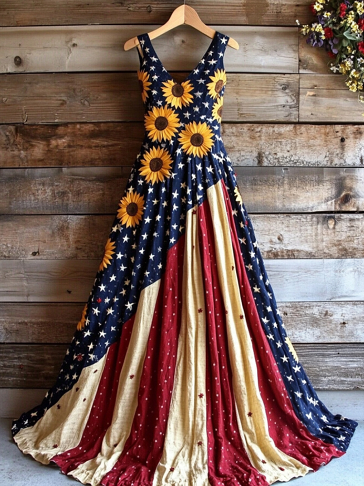 Women's Vintage Independence Day Sunflower Art Linen Midi Dress