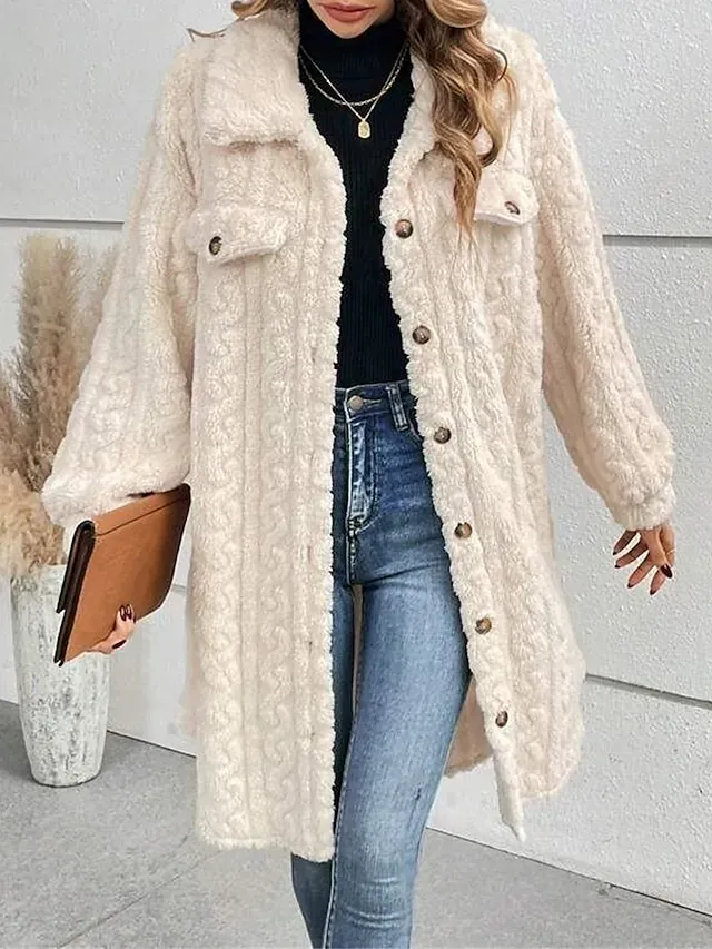 Women's Winter Coat Teddy Coat Coat Windproof Warm Outdoor Street Daily Going out Button Pocket Fleece Lined Single Breasted Lapel Fashion Plush Casual Minimalism Solid Color Regular Fit Outerwear