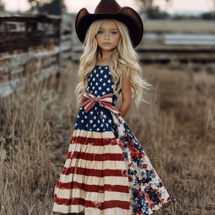 Young Girl's Independence Day America Flag Patchwork Floral With Bow Art Linen Tank Dress(with Belt)