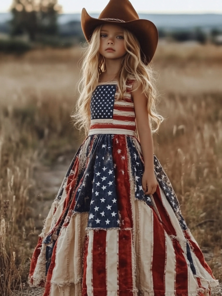 Young Girl's Independence Day America Flag Patchwork Print Linen Tank Dress(with Belt)