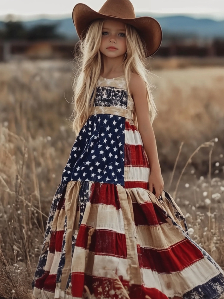 Young Girl's Independence Day Patchwork America Flag Print Linen Tank Dress