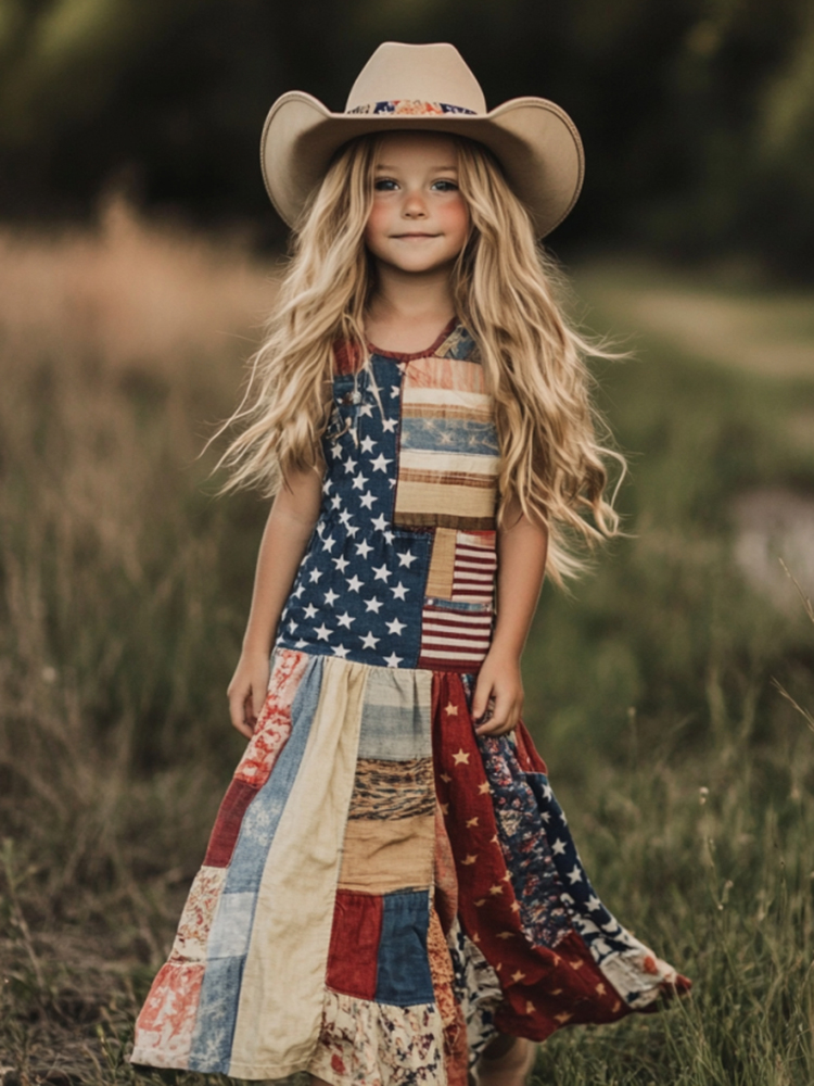 Young Girl's Patchwork Independence Day America Flag Print Linen Tank Dress(with Belt)