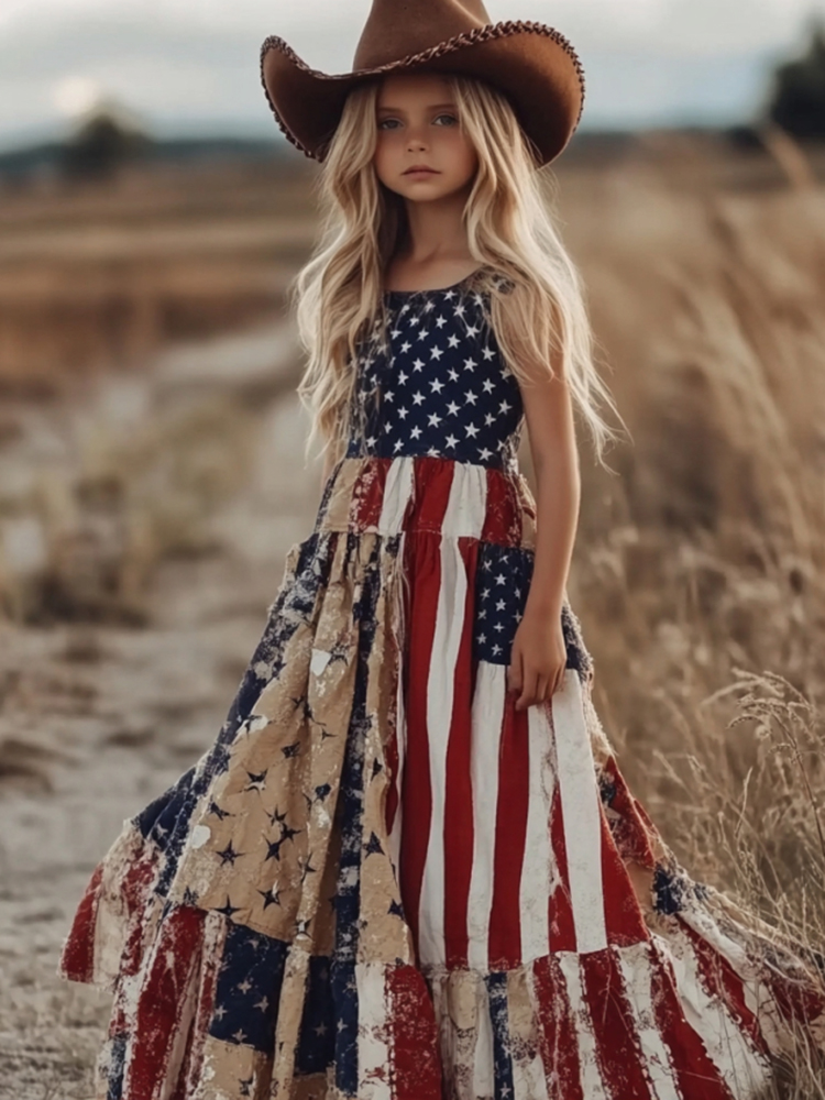 Young Girl's Vintage Independence Day Patchwork America Flag Print Linen Tank Dress(with Belt)