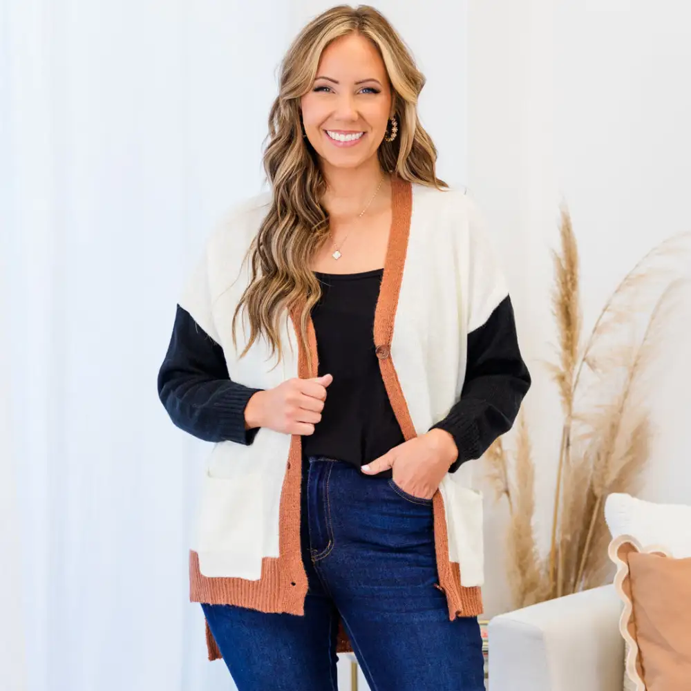 This cardigan is your perfect fall staple, with a multi-colored color block design and functional buttons for added convenience! Add a pop of color to your wardrobe with this cozy and stylish piece!